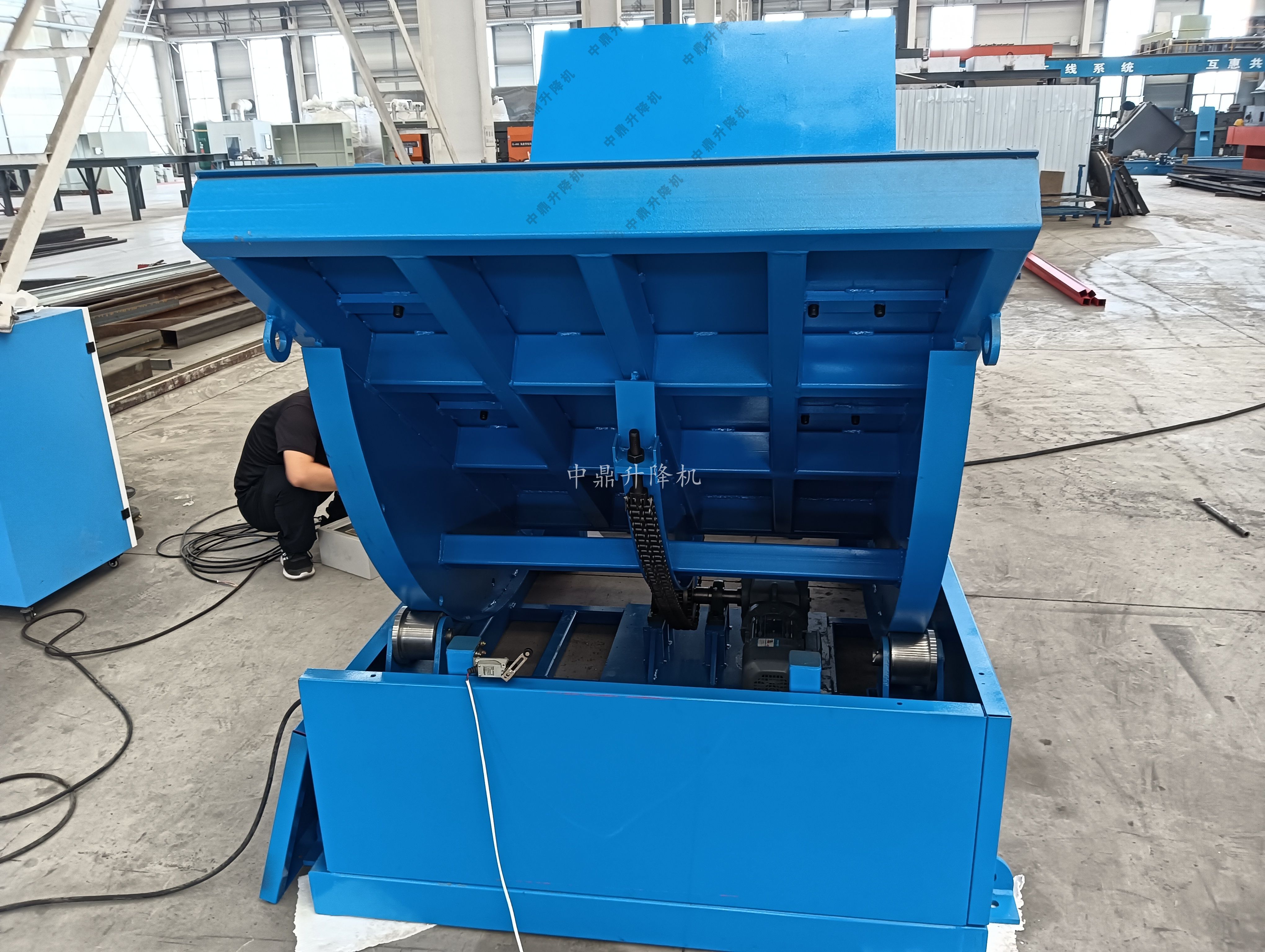 鏈條翻轉平臺是一種專門用于重型工件(如模具、鑄件、機械零部件等)提升和翻轉作業的機械設備。該設備通過鏈條傳動系統實現工件的精準提升和翻轉,最大承載量為10噸,廣泛應用于制造業、維修廠以及物流領域。